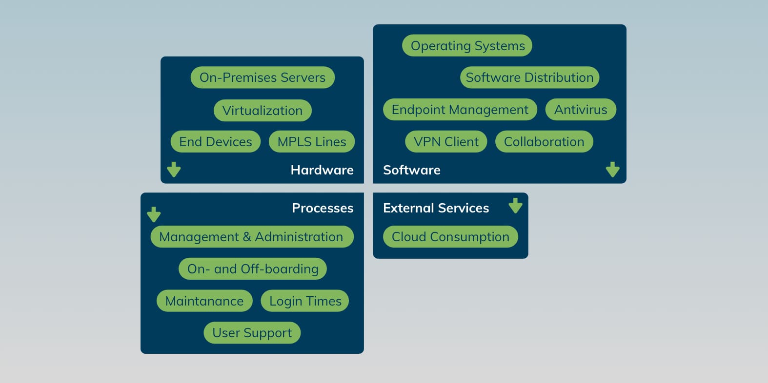 Die digitalen Arbeitsplätze von oneclick™ führen in zahlreichen Bereichen zu Einsparungen im Vergleich zu traditionellen IT-Infrastrukturen. Mit dem Einsatz von oneclick™ als vollständiger Plattform-Service für die Anwendungsbereitstellung können Sie Einsparungen in Hardware, Software, Prozessen und externen Dienstleistungen erzielen.